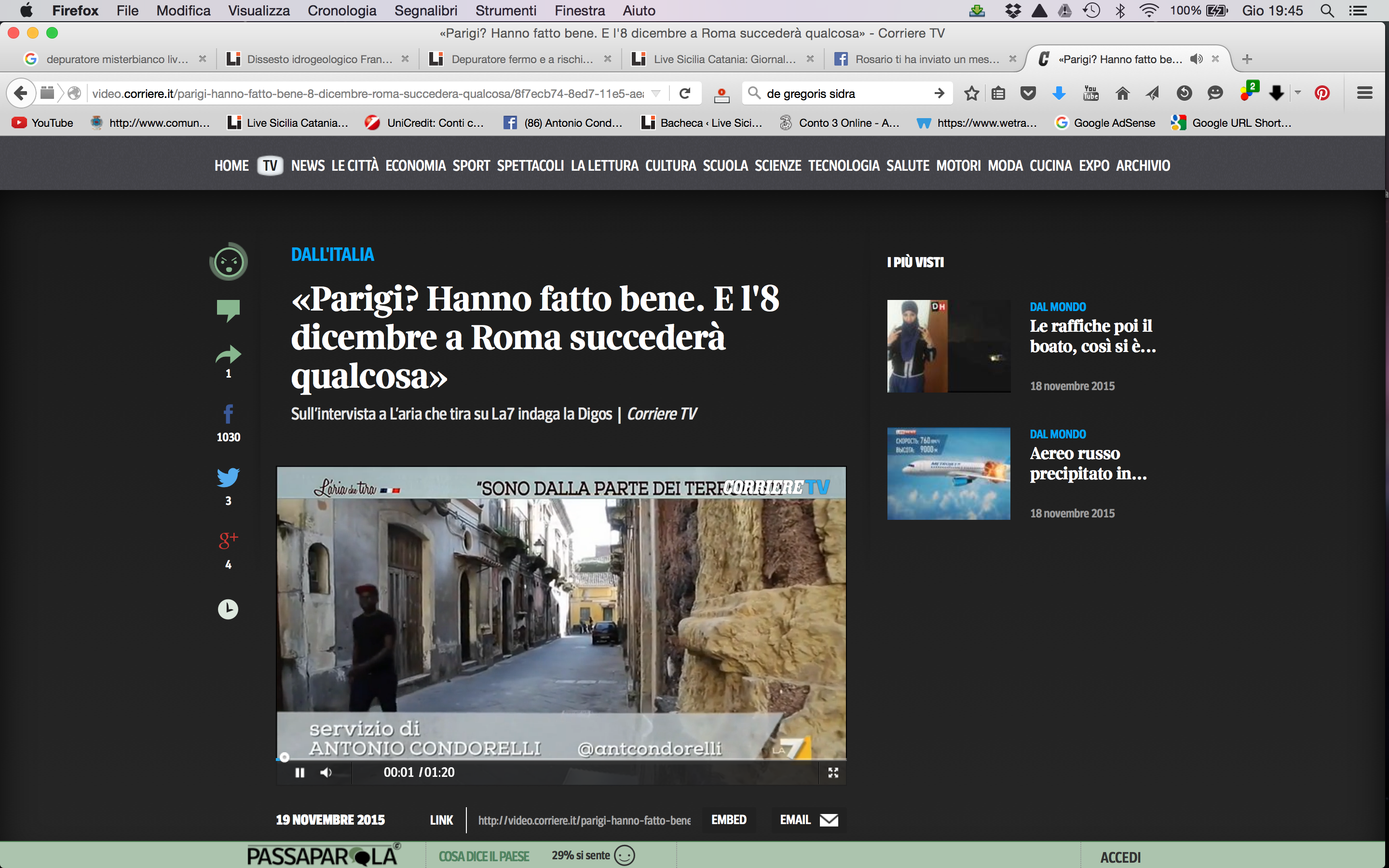 Antonio Condorelli, inviato de L’Aria che tira, incontra un ragazzo arabo – residente a Catania da 5 anni – che si dice contento degli attentati di Parigi: «È quello che dice il nostro Corano, hanno fatto bene. Voi continuate a uccidere la nostra gente in Siria e in Palestina, noi uccidiamo i francesi. Nel 2025, vedrete, la Francia diventerà tutta musulmana: non siamo stati noi stranieri a fare queste cose, è gente nata lì, che crescendo scopre cos’è l’Isis, cos’è l’Islam». Poi un’agghiacciante profezia: «L’8 dicembre, giuro, succederà qualcosa a Roma. L’ho letto su Facebook. La vostra non è una guerra contro l’Islam, è una guerra contro Dio. Volete una guerra con Dio?». La Digos ha subito chiesto il materiale del servizio, gli investigatori stanno lavorando. GUARDA IL VIDEO SUL CORRIERE DELLA SERA